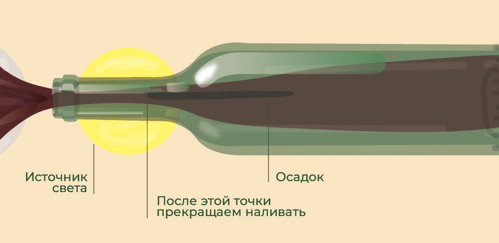 - Прекращайте переливать напиток, как только заметите первые признаки осадка — посторонние частицы или мутную жидкость в горлышке бутылки.